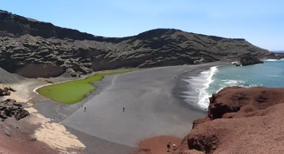 La Playa de la Laguna de los Ciclos es otra de las playas que hay que visitar en Lanzarote si lo que nos gusta son los paisajes pintorescos. En esta playa se produce un contraste bonito entre diferentes colores, surgidos de forma natural en los diferentes elementos. La arena negra que forma la playa contrasta con el color rojizo de alguna de sus rocas, y con el verde de una extraña laguna que se encuentra dentro de las propias arenas de la playa.